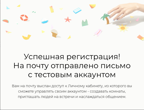 Вам на почту выслан доступ к Личному кабинету, из которого вы сможете управлять своим аккаунтом - создавать комнаты, приглашать людей на встречи и наслаждаться общением.